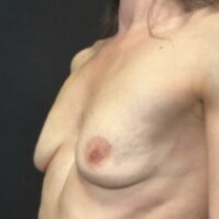 Na 20 kg te zijn afgevallen, had mw ook volume verloren bij de borsten. De wens was meer volume met een natuurlijke vorm. We hebben gekozen voor anatomische protheses (355 cc), om zoveel mgl de lichte ptosis (hangende borst) te corrigeren met alleen een prothese, zonder de littekens van een lift. De prothese ligt deels onder de spier voor de natuurlijke look, dual plane.