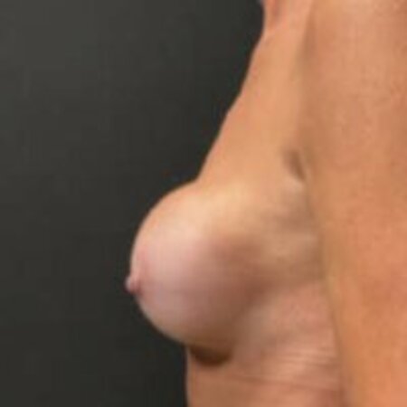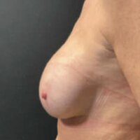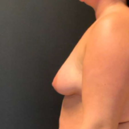 Twaalf jaar geleden liet deze vrouw een borstvergroting doen. Ze stoorde zich nu erg aan de vorm van haar borsten, met verhardingen en een verschil tussen links en rechts. Er was sprake van forse kapselvorming en haar eigen klierweefsel zakte over de oude protheses heen, waardoor haar tepels laag en uitgezakt stonden. Haar wens was om weer zachte en symmetrische borsten te krijgen. We hebben een prothese wissel gedaan gecombineerd met een borstlift. Eerst verwijderden we het verharde kapsel en verplaatsten de holte waar de prothese ligt van boven naar deels onder de spier (dual plane). We plaatsten 295cc ronde protheses en voerden een borstlift uit, waarbij we rechts iets meer weefsel wegnamen dan links om de symmetrie te verbeteren.